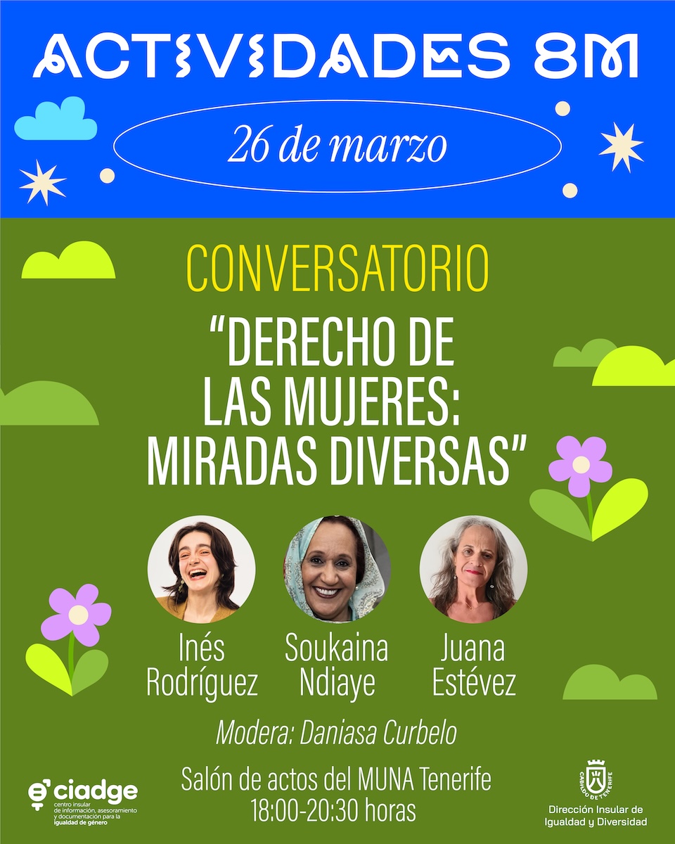 El 26 de marzo, tendrá lugar el Conversatorio “Derechos de las mujeres: miradas diversas”, en el que tres mujeres con realidades y trayectorias distintas conversarán sobre dificultades y retos sobre los derechos de las mujeres desde la diversidad. Participará Inés Rodríguez, la joven logopeda tinerfeña, colaboradora actualmente del programa El Intermedio, que se hizo viral en redes sociales compartiendo en tono de humor las situaciones a las que se enfrenta teniendo parálisis cerebral. Intervendrá también Soukaina Ndiaye, activista y presidenta de la Red-Migrante Tenerife, coordinadora de la Asociación de Mujeres Africanas en Canarias (AMAC) y representante de Mujeres Saharauis en Canarias. Participará asimismo Juana Estévez, actriz y activista trans tinerfeña que ha destacado por su labor de visibilización y defensa de los derechos del colectivo LGTBIQA+. El debate será conducido por Daniasa Curbelo, artista transdisciplinar, activista e investigadora en torno a la memoria, la disidencia sexual, la canariedad y el género. Será en el Salón de actos del MUNA, de 18:00 a 20:30 horas.