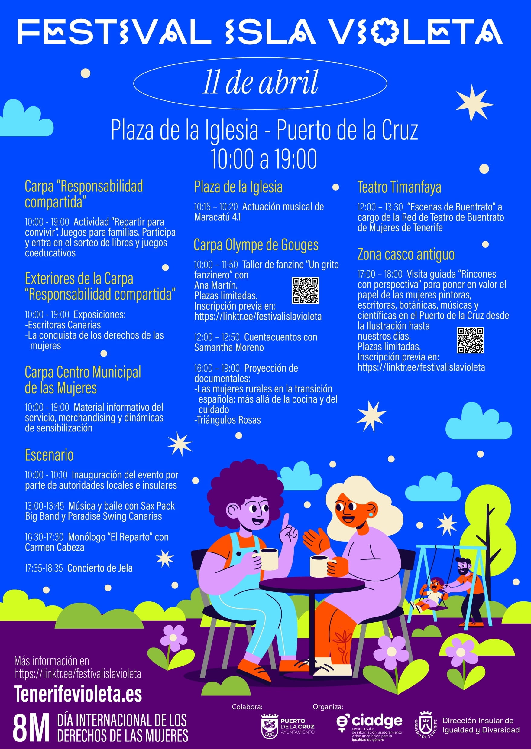 El 21 de marzo se celebrará el “Festival Isla Violeta”, en el Puerto de la Cruz, con la colaboración de su Ayuntamiento. A través del Centro Insular de Información, Asesoramiento y Documentación (CIADGE), está prevista la realización de cuentacuentos para peques y juegos para toda la familia con los que pensar conjuntamente sobre el reparto de las tareas. Se presentará la novela “La viuda blanca”, con su autora María del Mar Rodríguez. También habrá un monólogo de humor a cargo de la cómica Carmen Cabeza y en el teatro Timanfaya se podrá disfrutar de la “Red de Teatro de Buentrato de Mujeres de Tenerife” con mujeres mayores de toda la isla como protagonistas. Además, se desarrollará un taller de fanzine, y además habrá música en directo con la cantante Jela y la Sax Pack Big Band y baile con Paradise Swing Canarias. Exposiciones, ruta con perspectiva de género, sorteos y otras muchas actividades desde las 10:00 hasta las 20:00 horas.